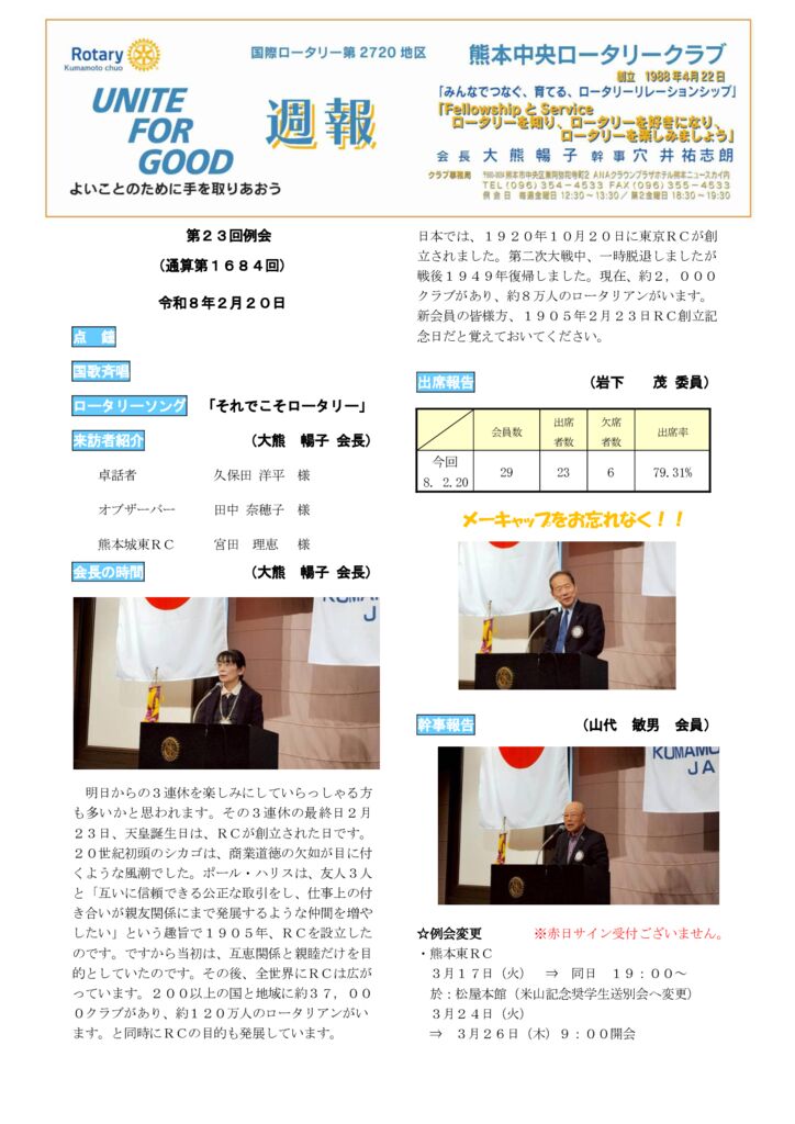 週報【令和3年6月4日号】 第24回例会(通算1521回) ・会長の時間 ・幹事報告 ・近況報告 ...etc 週報を読む 週報を読む バックナンバー ー BackNumber ー 週報【令和8年2月20日】 週報【令和8年2月6日】 週報【令和8年1月30日】 週報【令和8年1月23日】 週報【令和8年1月7日】 週報【令和7年12月19日】 週報【令和7年12月12日】 週報【令和7年12月5日】 週報【令和7年11月21日】 週報【令和7年11月13日】 週報【令和7年10月31日】 週報【令和7年10月23日】 週報【令和7年10月10日】 週報【令和7年10月3日】 週報【令和7年9月12日】 週報【令和8年2月20日】 熊本中央 ロータリークラブ事務局 〒860-0034 熊本市中央区東阿弥陀寺町2 ANAクラウンプラザホテル 熊本ニュースカイ内 TEL:096-354-4533 例会:金曜日12:30〜 第二金曜日18:30〜 MENUHOME 会長挨拶 ロータリークラブについて 行事計画 週報 お問い合わせ