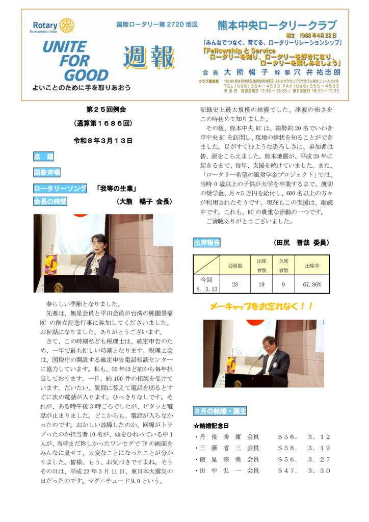 週報【令和5年1月20日号】 通常例会 第22回例会(通算1574回) ・会長挨拶 ・幹事報告 ・...etc 週報を読む 週報を読む バックナンバー ー BackNumber ー 週報【令和8年3月13日】 週報【令和8年3月6日】 週報【令和8年2月20日】 週報【令和8年2月6日】 週報【令和8年1月30日】 週報【令和8年1月23日】 週報【令和8年1月7日】 週報【令和7年12月19日】 週報【令和7年12月12日】 週報【令和7年12月5日】 週報【令和7年11月21日】 週報【令和7年11月13日】 週報【令和7年10月31日】 週報【令和7年10月23日】 週報【令和7年10月10日】 週報【令和8年3月13日】 熊本中央 ロータリークラブ事務局 〒860-0034 熊本市中央区東阿弥陀寺町2 ANAクラウンプラザホテル 熊本ニュースカイ内 TEL:096-354-4533 例会:金曜日12:30〜 第二金曜日18:30〜 MENUHOME 会長挨拶 ロータリークラブについて 行事計画 週報 お問い合わせ
